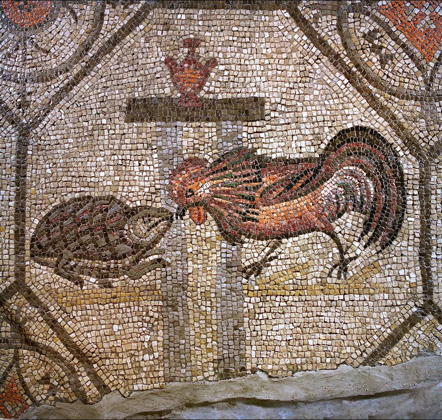 La raffigurazione del gallo e della tartaruga, secondo alcune fonti interpretative, potrebbe alludere all’eterna lotta tra il bene e il male. Il gallo qui inteso come simbolo della luce, annuncia il nuovo giorno, segno di speranza e rivelazione, mentre la tartaruga, la cui etimologia deriva dal greco tartarukos, “abitante del tartaro”, è cifra delle tenebre (inferi) e di riflesso del mondo ctonio, temibile e indistinto. Tuttavia, in altri contesti antichi, la scena assume ulteriori significati: la tartaruga nel suo carapace diventa raffigurazione dell’Oriente, contraddistinto da saggezza e stabilità, mentre il gallo rappresenterebbe l’Occidente, troppo indaffarato in atti mondani. Nell’iconografia antica greca, gallo e tartaruga accompagnano Hermes o Mercurio, il messaggero degli Dei, e ciò attesta un forte legame con le simbologie pagane, risemantizzate in età cristiana. Nel mosaico esaminato, la tartaruga espone il profilo destro e si colloca a sinistra del lettore e il gallo, a destra, espone il suo profilo sinistro. I due animali si avvicinano e si scrutano, quasi a fronteggiarsi. Per apprezzare appieno la raffigurazione decisamente naturalistica delle bestiole, si consiglia una lettura bimanuale della scena tradotta in disegno a rilievo, che permetta di individuare dapprima i soggetti enunciati e successivamente lo sfondo in cui vediamo raffigurata una colonnina, sormontata dal premio che spetterà al vincitore del confronto ingaggiato.