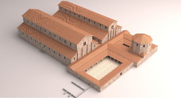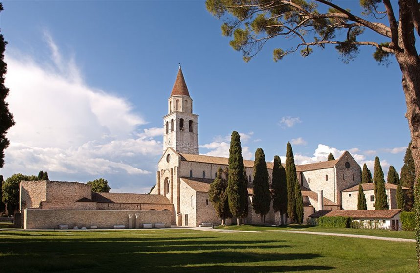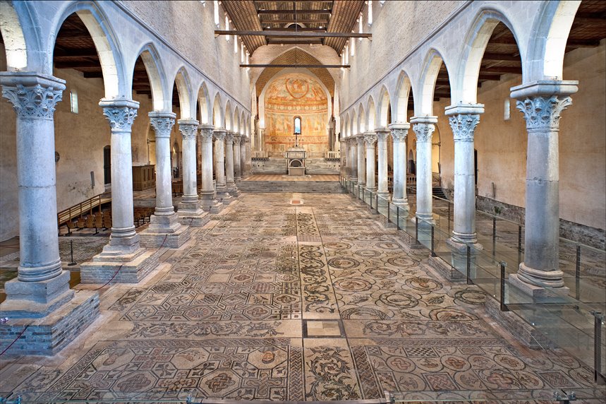 Dall’ingresso possiamo osservare il pavimento musivo. Il mosaico ricopriva l’Aula Sud di Teodoro, uno dei tre ambienti principali che costituivano la sede vescovile eretta al tempo dell’imperatore Costantino. Teodoro infatti, ricordato nell’epigrafe inserita nel pavimento (nella Scena di Pesca), aveva costruito un complesso cultuale perfettamente rispondente alle esigenze liturgiche del tempo. Acquistata la zona urbana dove sorgevano alcuni magazzini, li demolì ed innalzò un complesso ad U: due aule rettangolari parallele (Aula Sud e Aula Nord), collegate fra loro da una trasversale, pure rettangolare; tra le due parallele, a est della trasversale, trovarono posto il battistero, ambienti di servizio e l’ingresso a tutto il complesso. Del complesso si possono vedere in Basilica: il mosaico all’Aula Sud, parte del cocciopesto dell’Aula Trasversale, parte del mosaico del corridoio d’ingresso; nella Cripta degli Scavi, i resti dei mosaici dell’Aula Nord, il resto del cocciopesto dell’aula di collegamento e i pavimenti degli ambienti di servizio; non sono visibili i resti del primitivo battistero con vasca ellittica. Secondo alcuni studiosi, l’Aula Sud serviva da catecumeneo, mentre l’Aula Nord era riservata alla celebrazione della Messa; altri invece ritengono il contrario. L’aula di collegamento serviva sia da spogliatoio (prima del Battesimo per immersione), sia per il conferimento del sacramento della Cresima.